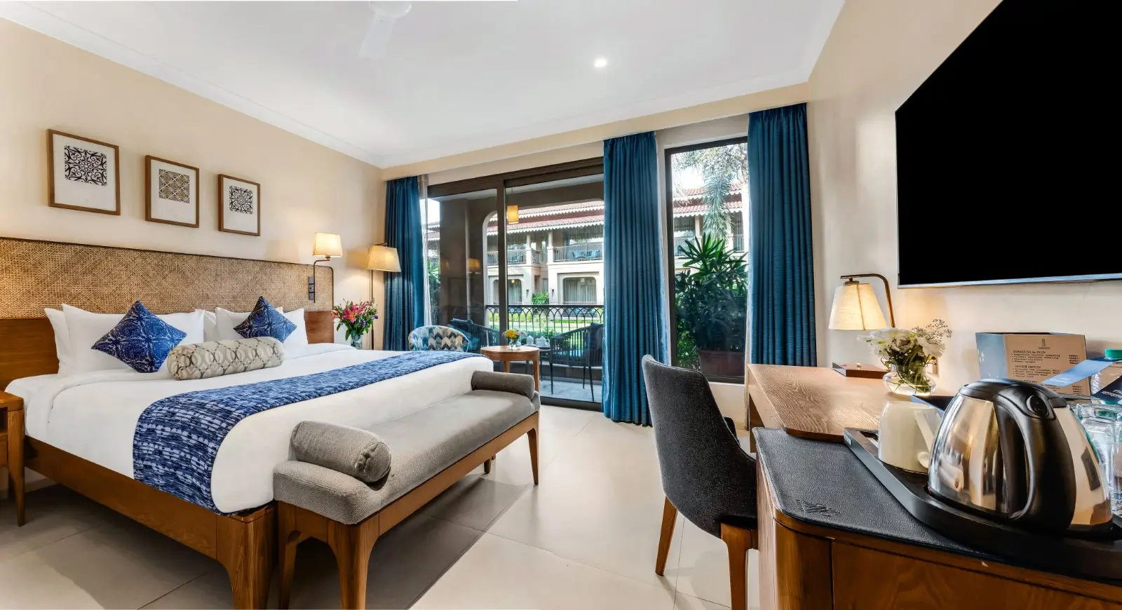The 280 sq ft Premium Garden View Rooms at Marquis Beach Resort Goa are designed as a gentle escape from the everyday, with a harmonious, retreat-like mood that feels instantly calming. Abundant natural light streams through large windows, while refreshing décor and a relaxed ambience give the room a zen-like finish. Step onto your balcony for views of well-manicured gardens, with partial glimpses of the beach and pool, bringing the easy charm guests love in sea view hotels in Goa.